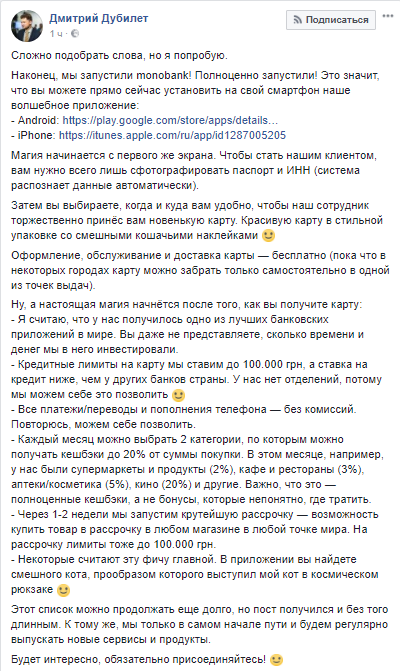 Команда бывших топ-менеджеров Приватбанка запустили первый мобильный банк Monobank, который не предполагает ни одного отделения. Об этом сообщил соучредитель проекта Дмитрий Дубилет на своей странице в Facebook