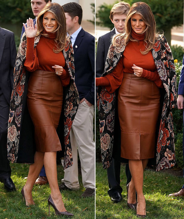 Первая леди США выбрала для мероприятия бордовый гольф, коричневую кожаную юбку миди с разрезом и пальто с цветочным принтом. Образ она дополнила туфлями на шпильке, аккуратной прической и неброским макияжем.