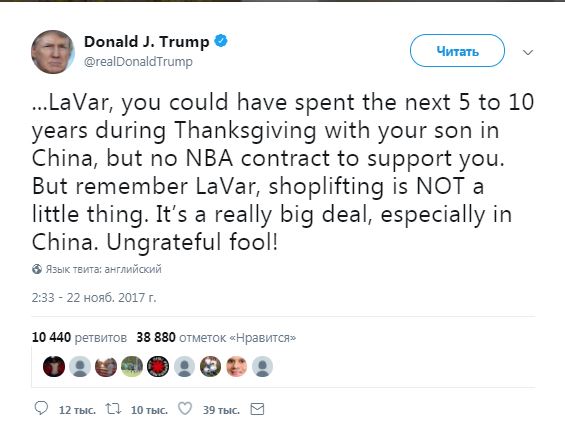 "Лавар, ты бы мог проводить День Благодарения в следующие 5-10 лет со своим сыном в Китае", - написал Трамп в Twitter. Президент добавил, что кража в магазине - это не ерунда, а серьезное дело, особенно для Китая.
