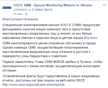 В среду, 22 ноября, на второй день после переворота в "ЛНР", специальная мониторинговая миссия ОБСЕ продолжает фиксировать наличие военных автомобилей и присутствие неизвестных вооруженных мужчин в центре Луганска. Об этом говорится в сообщении миссии на странице в Facebook.