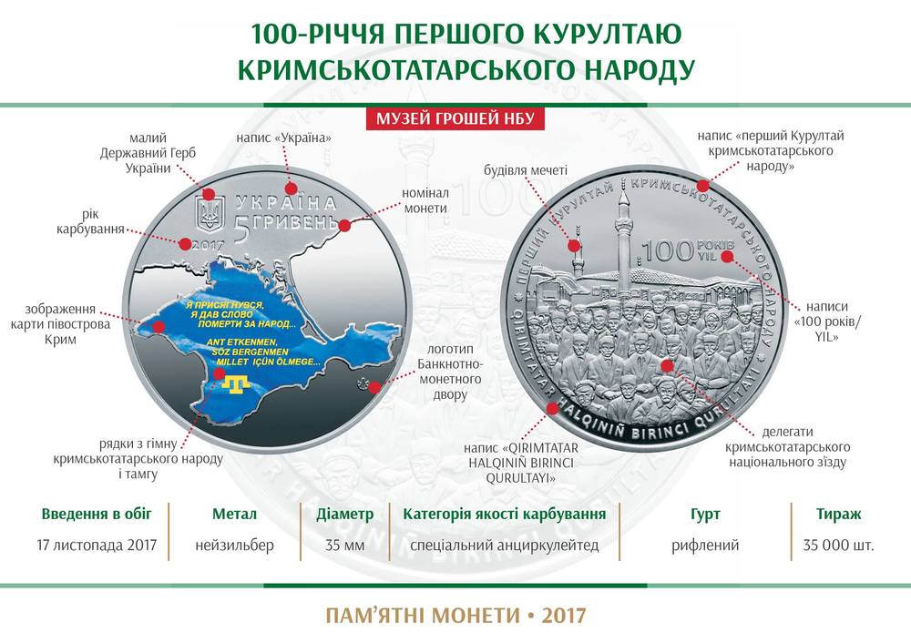 "Национальный банк Украины внимательно следит за общественно-политической жизнью государства и по случаю важного события в истории крымскотатарского народа - первого Курултая, национального съезда, который состоялся в ноябре 1917 года, выпустил памятную монету "100-летие первого Курултая крымскотатарского народа", - цитирует Сузанськую пресс-служба НБУ.