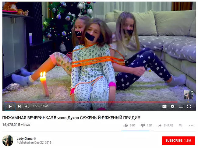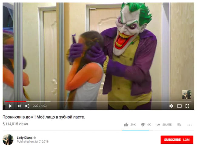 Например, у видео в канале Lady Diana, на котором трое девочек сидят связанные, больше 16 миллионов просмотров. В этом же канале есть видеозапись, где девочку пугает клоун и мажет ей лицо зубной пастой. У ролика пять миллионов просмотров.