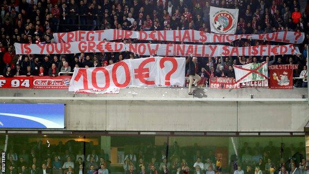 Такое поведение немецких фанатов, приехавших в Бельгию поддержать свою команду, было вызвано высокими ценами на билеты - от 70 до 100 евро. Кроме этого фаны "Баварии" вывесили банеры с резкой критикой УЕФА.