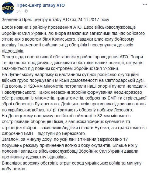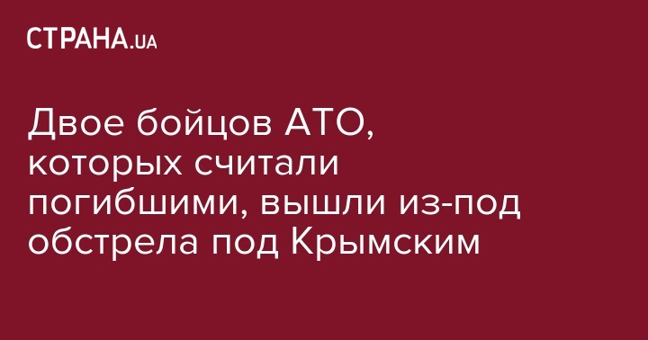 "Хорошие новости из района проведения АТО. Двое военнослужащих Вооруженных Сил Украины, которые вчера считались погибшими во время боевого столкновения с врагом у Крымского, благодаря своему боевому опыту и обучаемости вышли из-под обстрелов и вернулись к своим подразделениям", - говорится в сообщении.