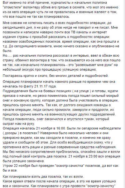 На следующий день после успешного завершения операции, 22 ноября в 11:00 появился скандальный пост. Волонтер не понимает о каком невыполненном задании заявил ТСН начальник полигона. По его данным, все выполнили на 100%. А более дальние поселки невозможно занять без тяжелой артиллерии, которая запрещена по минским договоренностям.