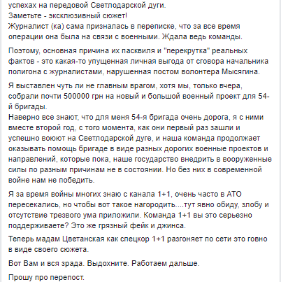 При этом сам волонтер дал многословный ответ в соцсети. В Facebook Юрий Мысягин сообщил, что произошел сговор начальника полигона 54-й механизированной бригады с журналистами, что после того, как боевая операция успешно завершится, журналисты этого канала получат эксклюзивное право рассказать об этой успешной операции и побывать на месте событий.