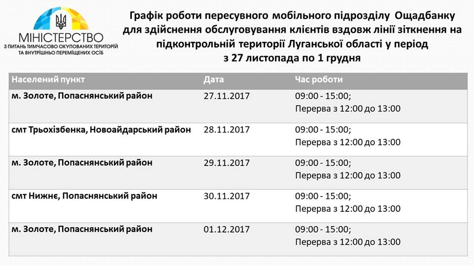 В период с 27 ноября по 1 декабря мобильное подразделение "Ощадбанка" будет обслуживать клиентов вблизи линии соприкосновения в Луганской области.