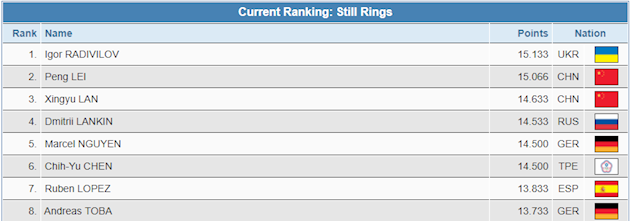 Наш соотечественник с результатом 15.133 балла занял первое место, на 0.067 балла опередив основного конкурента, Пенг Лея из Китая. Третий результат показал еще один китаец Чингун Лана.