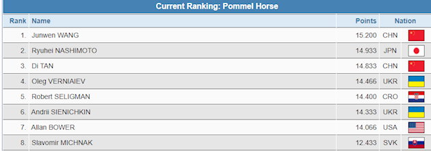 В упражнениях на коне еще одному украинцу Олегу Верняеву чуть-чуть не хватило до тройки призеров, а Андрей Сеничкин стал шестым.