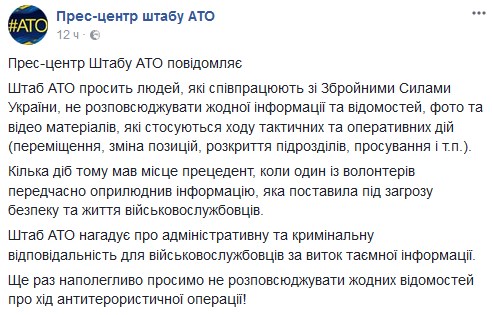"Штаб АТО напоминает об административной и уголовной ответственности для военнослужащих за утечку секретной информации. Еще раз настойчиво просим не распространять никаких сведений о ходе антитеррористической операции!" – отметили в штабе.