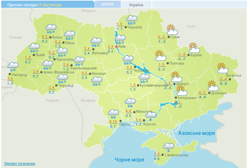 В понедельник, 27 ноября, синоптики обещают сильный дождь с мокрым снегом в западных областях Украины. Об этом говорится в сообщении Укргидрометцентра, о непогоде предупреждают также в ГосЧС.