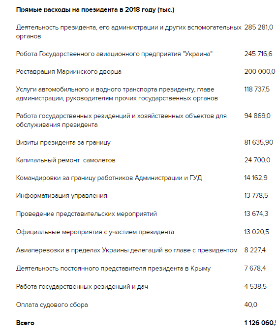 Больше всего денег из государственной казны будет потрачено на обеспечение деятельности самого президента, его администрации и вспомогательных органов, а именно 285,2 миллиона гривен.