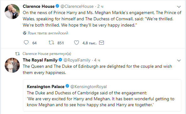 После сообщения о помолвке принца Гарри с актрисой Меган Маркл его принялись поздравлять члены британской королевской семьи. Свои официальные комментарии опубликованы в Twitter-странице Кларенс-хаус, вестминстерской резиденции членов британской королевской семьи.