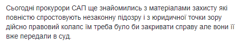 "Сегодня прокуроры САП еще знакомились с материалами защиты, которые полностью опровергают незаконное подозрение и с юридической точки зрения действительно правовой коллапс им надо было бы закрывать дело но они ее уже передали в суд", - пишет Насиров (пунктуация сохранена как у автора, - Прим.Ред.).