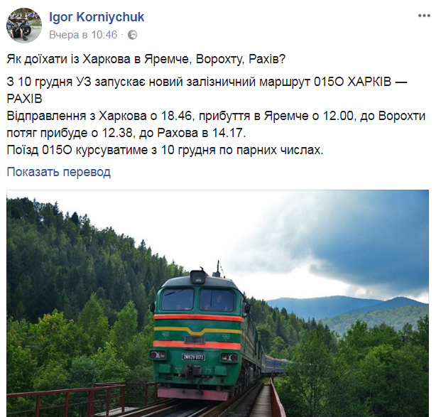 "Отправление из Харькова в 18.46, прибытие в Яремче в 12.00. В Ворохту поезд прибудет в 12.38, в Рахов в 14.17. Поезд 015О будет курсировать с 10 декабря по четным числам ", - говорится в опубликованном сообщении.