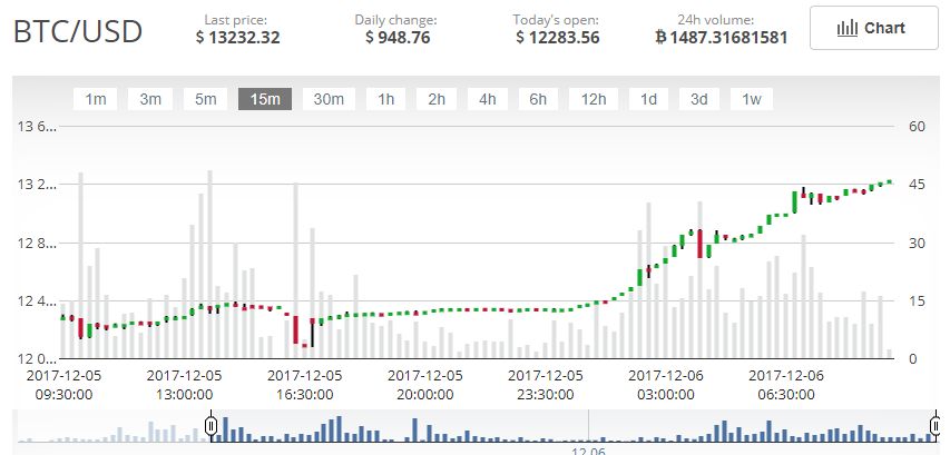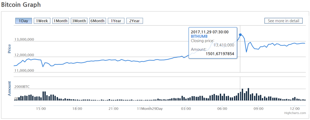 На южно-корейской бирже Bithumb, где традиционно самый высокий курс, биткоин перевалил за 12 тысяч и приближается к 13. Курс на текущий момент - 12 810 долларов.