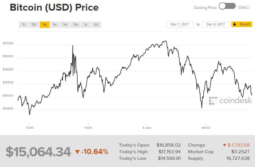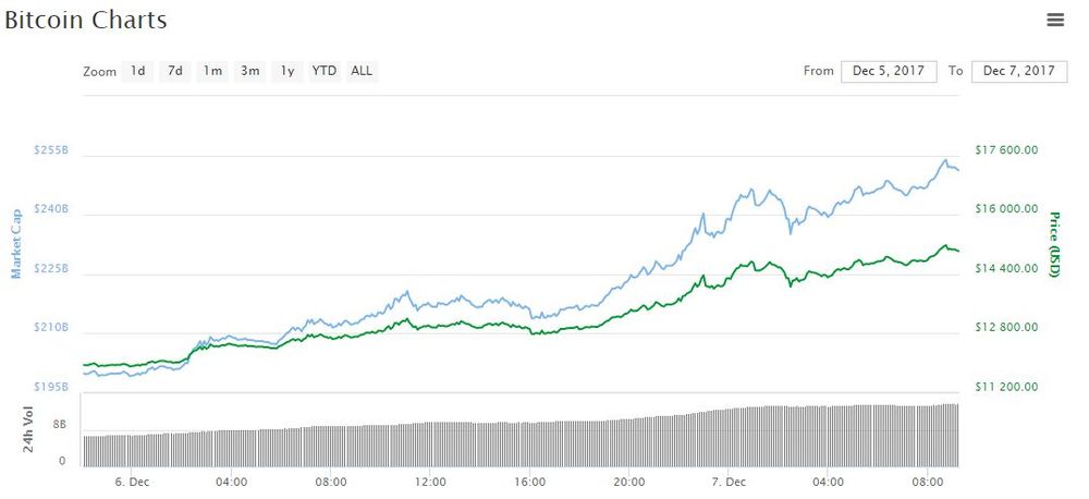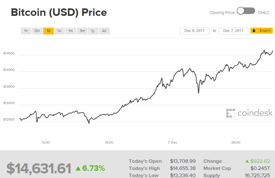 Биткоин продолжает расти, хотя на графигах некоторых бирж видно небольшое падение с утра. Биржа Coindesk дает цену в 15 064 долларов.