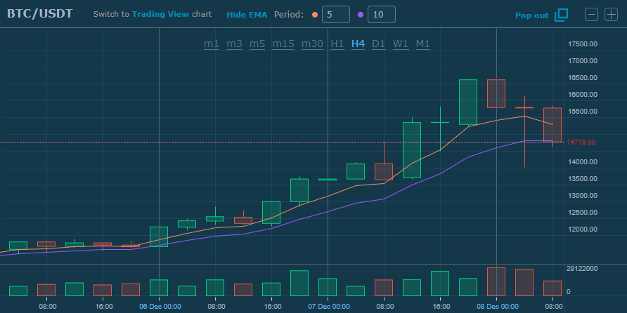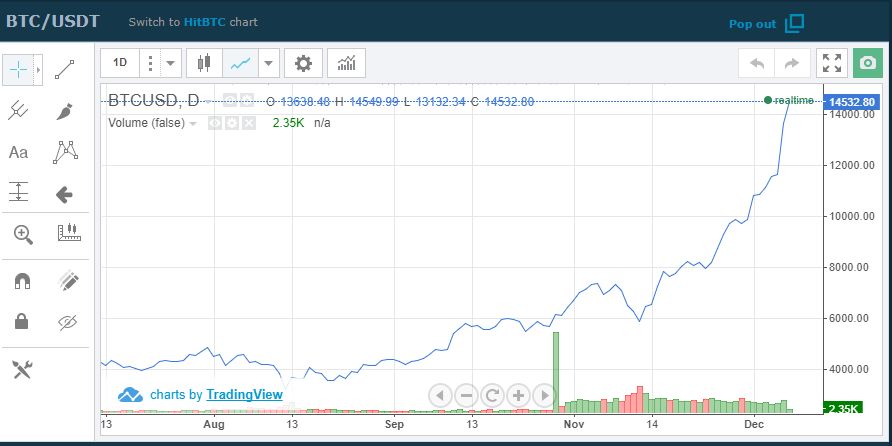 Биржа HitBTC показывает курс популярной криптовалюты 14 950 долларов.