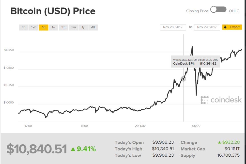 Это рост на две тысячи в день: во вторник, 28 ноября, он превысил на той же бирже $11 000.