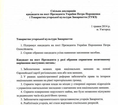 Общую декларацию Порошенко и закарпатских венгров публикует "Европейская правда".