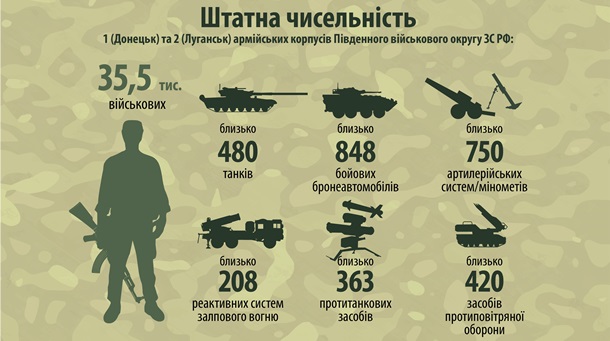 "Действуют 1-й армейский корпус в Донецке и 2-й армейский корпус в Луганске... Всего на востоке Украины находятся свыше 35 тыс. человек", – сказал Аваков.