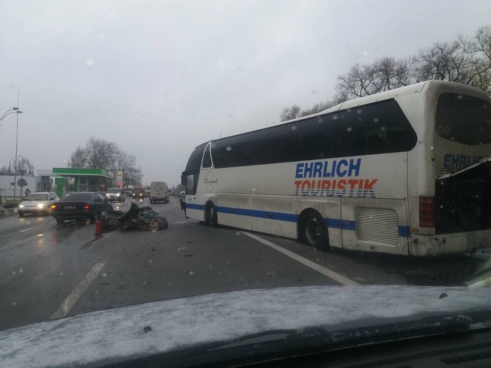 В ДТП попали туристический автобус и две фуры, которые вынесло на обочину. Подробности ДТП пока не сообщаются, про пострадавших информации также нет.