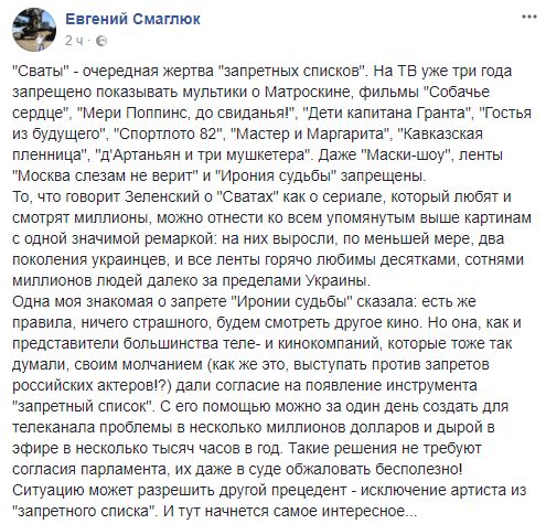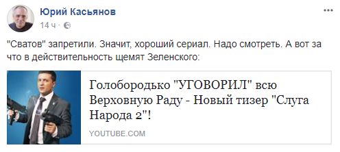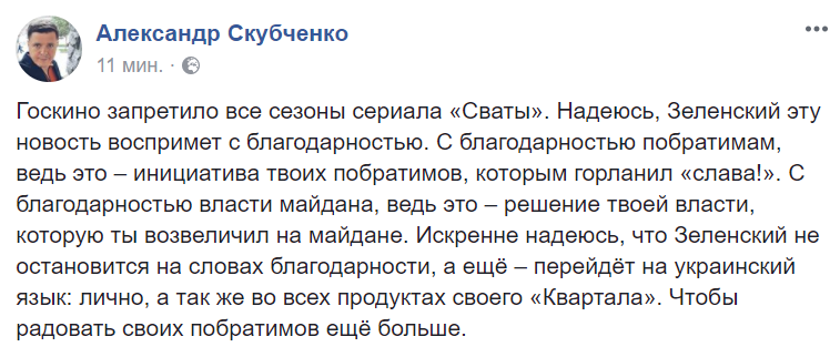 "Госкино запретило все сезоны сериала "Сваты". Надеюсь, Зеленский эту новость воспримет с благодарностью. С благодарностью побратимам, ведь это – инициатива твоих побратимов, которым горланил "слава!". С благодарностью власти майдана, ведь это – решение твоей власти, которую ты возвеличил на майдане. Искренне надеюсь, что Зеленский не остановится на словах благодарности, а ещё – перейдёт на украинский язык: лично, а так же во всех продуктах своего "Квартала". Чтобы радовать своих побратимов ещё больше".