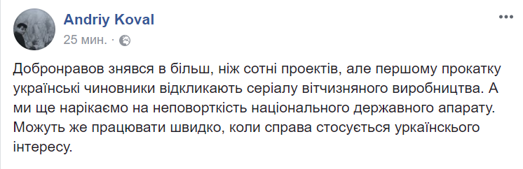 "Добронравов снялся в более чем сотне проектов, но первой прокатку украинские чиновники отзывают у сериала отечественного производства. А мы еще жалуемся на неповоротливость национального государственного аппарата. Могут же работать быстро, когда дело касается украинского интереса".