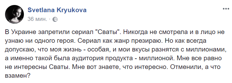 "В Украине запретили сериал "Сваты". Никогда не смотрела и в лицо не узнаю ни одного героя. Сериал как жанр презираю. Но как всегда допускаю, что моя жизнь - особая, и мои вкусы разнятся с миллионами, а именно такой была аудитория продукта - миллионой. Мне все равно не интересны Сваты. Мне вот знаете, что интересно. Отменили, а что взамен?"