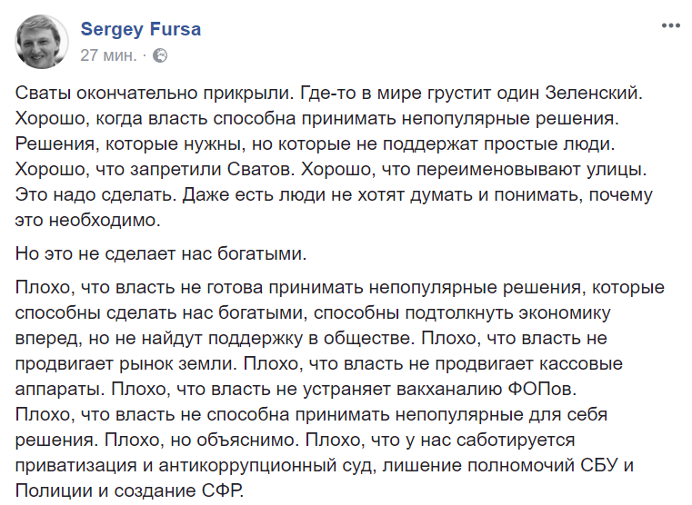 Плохо, что власть не готова принимать непопулярные решения, которые способны сделать нас богатыми, способны подтолкнуть экономику вперед, но не найдут поддержку в обществе. Плохо, что власть не продвигает рынок земли. Плохо, что власть не продвигает кассовые аппараты. Плохо, что власть не устраняет вакханалию ФОПов.