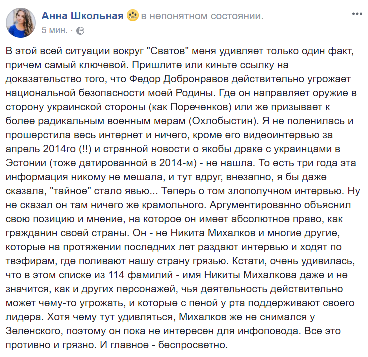 Журналист Анна Школьная пытается разобраться, в чем именно погрешил против безопасности Украины Федор Добронравов.