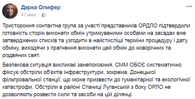 "Трехсторонняя контактная группа с участием представителей ОРДЛО подтвердила готовность сторон выполнить обмен пленных, исходя из стремления провести этот обмен в новогодних и рождественских праздников", - написала Олифер.
