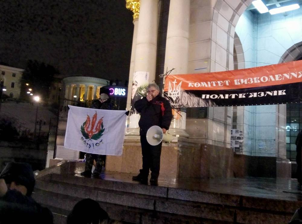 18:04 На Майдане сейчас около 50 человек. Они растянули баннер с надписью "Комитет освобождения политзаключенных"