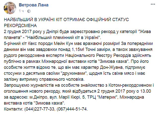 В субботу, 2 декабря в городе Днепр намерены зарегистрировать обладателя рекорда - самого большого племенного кота в Украине. Рекорд должны внести в категорию "Живая планета" Об этом сообщила руководитель Национального реестра рекордов Украины Лана Ветрова.