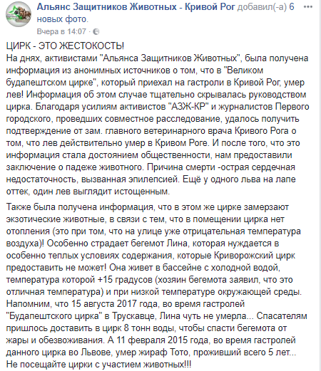 В Кривом Роге в "Большом будапештском цирке", который приехал на гастроли, от сердечной недостаточности умер лев. Об этом в Facebook сообщили активисты Альянса защитников животных Кривого Рога.