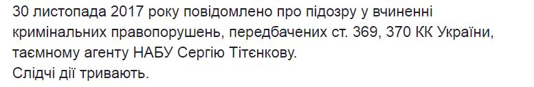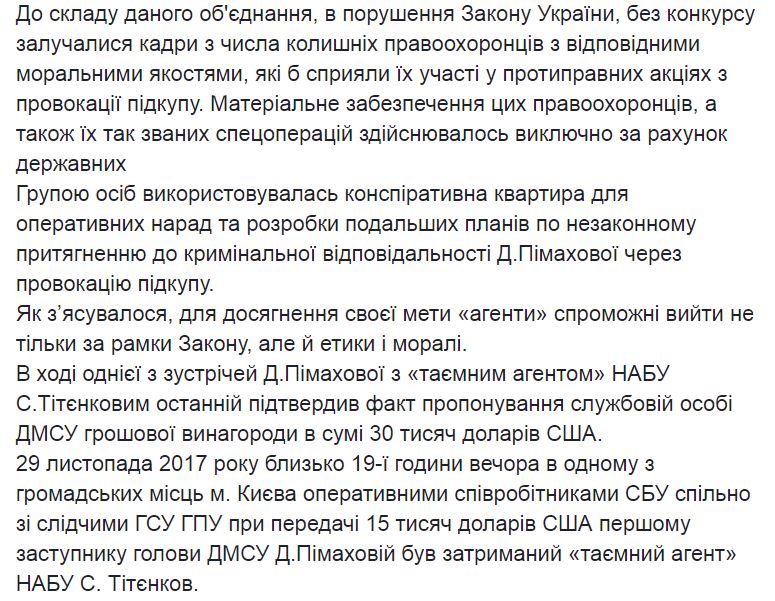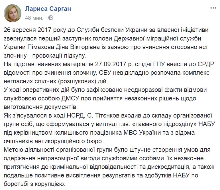 "Для достижения своей цели "агенты" способны выйти не только за рамки закона, но и этики и морали. В ходе одной из встреч Пимаховой с "тайным агентом" НАБУ С.Титенковым он подтвердил факт предложения должностному лицу ГМС денежного вознаграждения в сумме 30 000 долларов США. 29 ноября 2017 около 19 часов вечера в одном из общественных мест города Киева оперативными сотрудниками СБУ совместно со следователями ГПУ при передаче 15 000 долларов США Пимаховой был задержан "тайный агент" НАБУ Титенков", - говорится в сообщении Сарган.