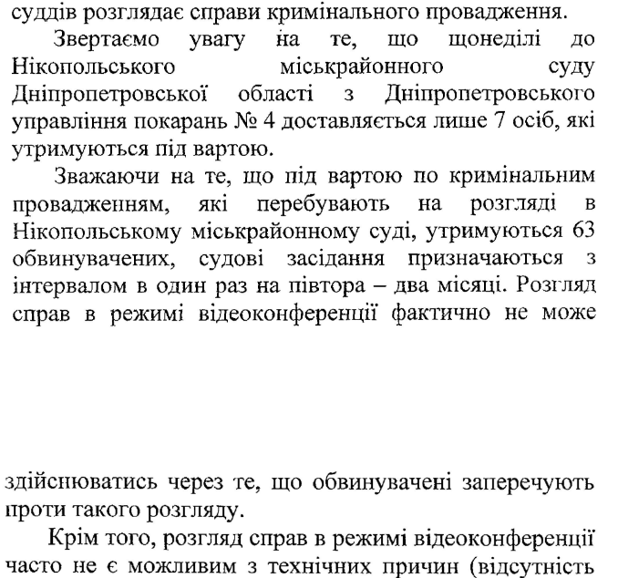 В связи с таким некомплектом судей и отсутствия всех необходимых условия для проведения заседаний в режиме видеоконференций, а также несогласия на такие заседания со стороны обвиняемых, в Никопольский межрайонный суд за отчетные промежутки времени доставляются по 7 лиц из Днепропетровского управления наказаний.