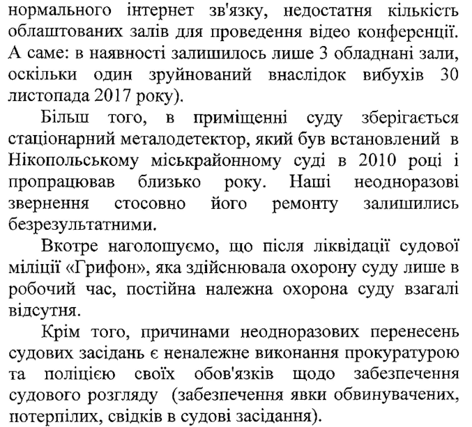 Из опубликованного текста стало известно, что вместо требующихся по штату 16 судей в Никопольском межрайонном суде на текущий момент работают всего 8. При этом нагрузка на них, в соответствии с расчетами Государственной судебной администрации (ДСА), соответствует нагрузке 20-х судей.