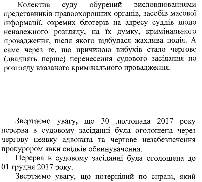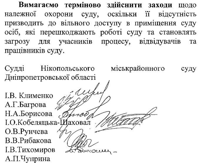 Судьи Никопольского межрайонного суда Днепропетровской области резюмировали свое обращение требованием принять меры по организации надлежащей охраны судебных заседаний, для недопущения повторения подобных трагедий.