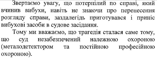 Именно это, а не халатность судей повлияло на решение о переносе того рокового заседания. Самому же взрыву способствовало отсутствие рабочего стационарного металодетектора. Представители суда неоднократно обращались с просьбой о его ремонте, однако не получили ответа. Также к трагедии привело отсутствие постоянной надлежащей охраны суда, после ликвидации спецподразделения МВД "Грифон".