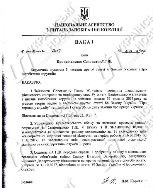 "Уволить Соломатину Анну Жоржевну, руководителя департамента контроля и мониторинга способа жизни Национального агентства по предотвращению коррупции, с занимаемой должности 31 октября 2017 года по согласию сторон согласно ч. 2 ст. 86 закона "о государственной службе" и п. 1 ст. 36 Кодекса законов о труде", - сказано в приказе, подписанном председателем НАПК Наталией Корчак.