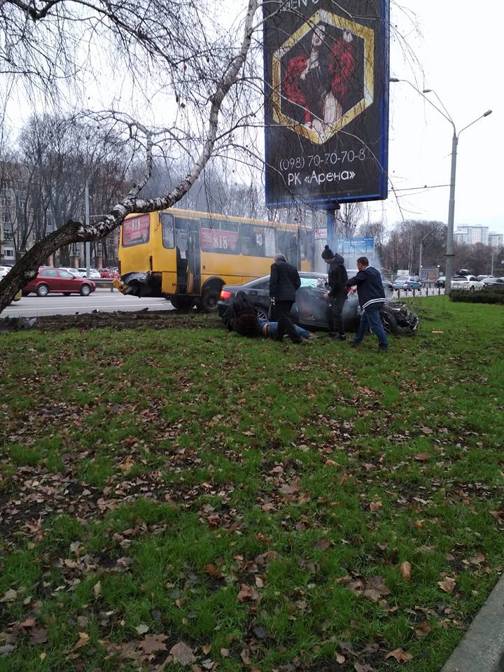 Сегодня, 3 декабря, в Киеве на проспекте Победы автомобиль врезался в маршрутку и вылетел с дороги. Об этом сообщает заместитель Министра информационной политики Дмитрий Золотухин на своей странице в Facebook.