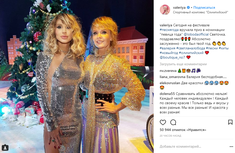 Певицу Светлану Лободу назвали не только "Женщиной года" в России, но и признали лучшей в номинации "Певица года" на российском фестивале "Песня года". Об этом сообщила российская певица Валерия в своем Instagram.