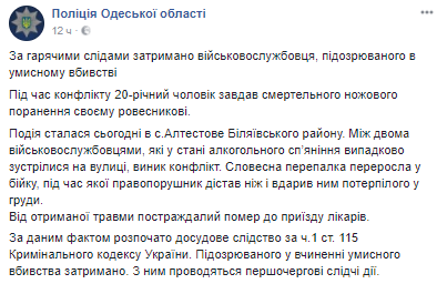 В Алтестово Одесской области 20-летний военный нанес смертельное ранение ножом своему ровеснику. Об этом сообщает пресс-служба Нацполиции Одесской области в Facebook.