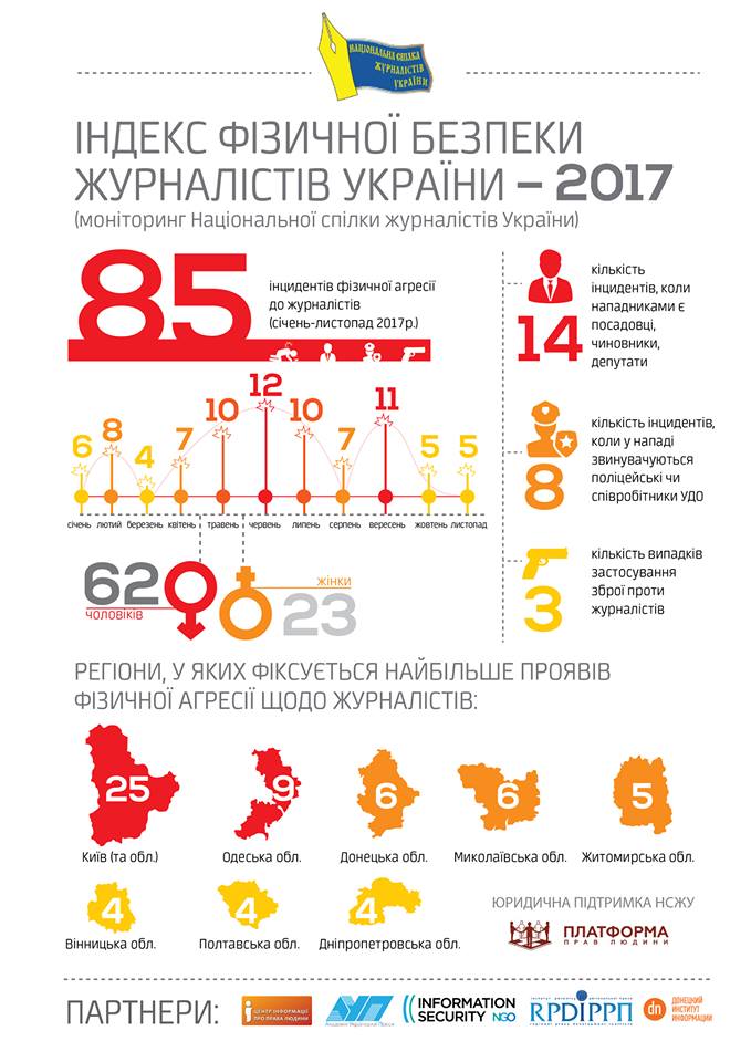 Инциденты происходили в Киеве, Николаеве, на Львовщине и в Черновцах. Согласно мониторингу "Индекс физической безопасности журналистов Украины", который НСЖУ проводит совместно с партнерскими организациями, с начала года (11 месяцев) зафиксировано 85 случаев проявлений физической агрессии по отношению к журналистам.