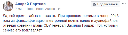 "Да, всё время забываю сказать. При прошлом режиме в конце 2013 года за фальсификацию электронной почты, видео и аудиофайлов отвечал советник главы СБУ генерал Василий Грицак - тот, который сейчас его возглавляет", - написал Портнов.