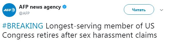 Самый старый член Конгресса США уходит в отставку после заявлений о сексуальных домогательствах. Об этом пишет агентство AFP.