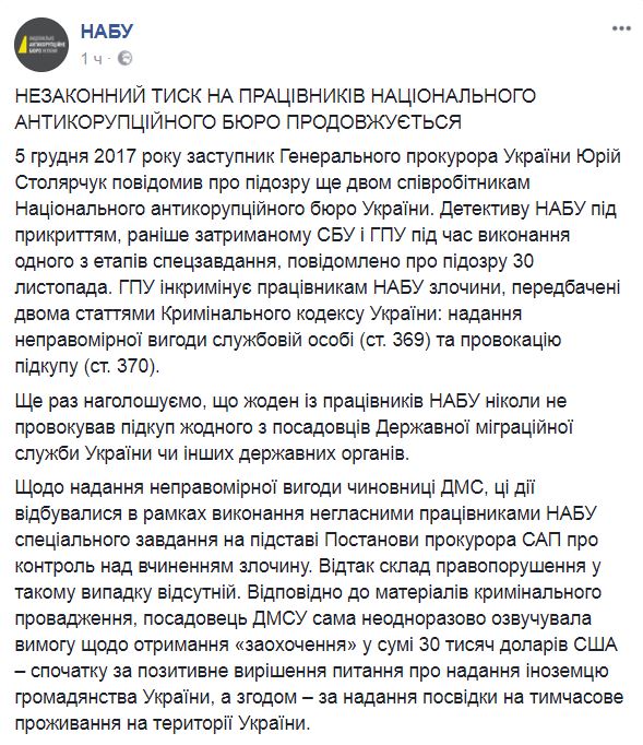 "Еще раз подчеркиваем, что ни один из сотрудников НАБУ никогда не провоцировал подкуп одного из должностных лиц Государственной миграционной службы Украины или других государственных органов. Относительно предоставление неправомерной выгоды чиновницы ДМС, эти действия происходили в рамках выполнения негласными работниками НАБУ специального задания на основании постановления прокурора САП" , - заявили в Национальном антикоррупционном бюро.
