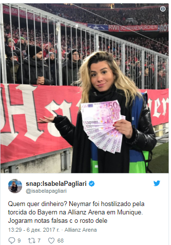 Болельщики Баварии забросали нападающего ПСЖ Неймара в одном из эпизодов матча фальшивыми купюрами достоинством в € 500. Примечательно, что брошенные в сторону бразильца купюры были "именными".