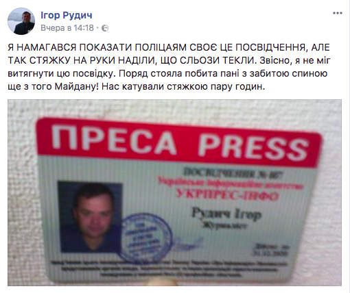 На своей странице в Facebook сам Рудич заявил, что пытался показать полиции пресс-карту, однако ему это не удалось.